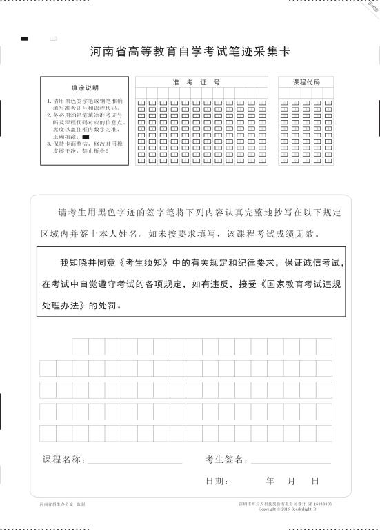 ? ? ? ? ?按照教育部考試中心[2015]127號《關(guān)于采集高等教育自學(xué)考試考生筆跡信息的通知》要求,從2016年起,參加自學(xué)考試考生每門課程都要采集筆跡信息,并隨合格課程成績記入考生考籍檔案。提醒所有考生要攜帶2B鉛筆、0.5黑色簽字筆、橡皮等考試工具。